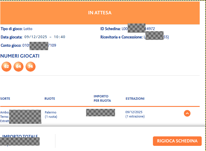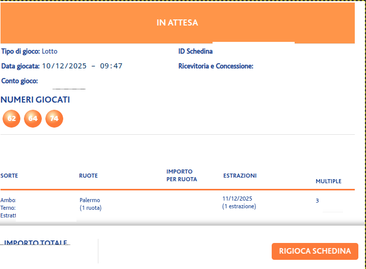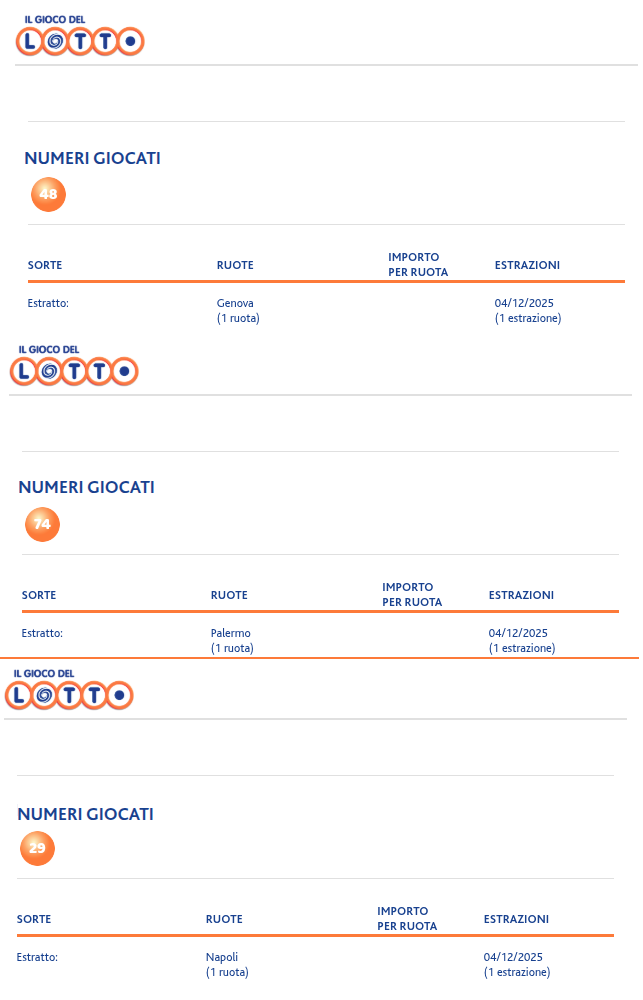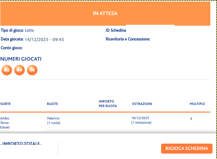 Scritto ilDicembre 14, 2025 Estrazioni Multiple 16-18-19-20/12/2025 per la ruota di Palermo 62 64 74 Solo per il 16/12/2025 Genova 57…
